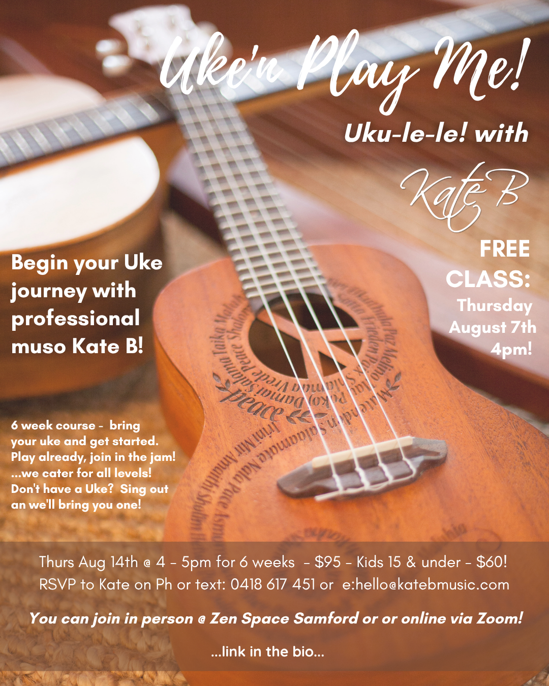 Join professional muso Kate B for this one hour workshop to kick start your Uke Journey!